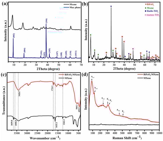 XRD of (a) MAX phase and Mxene and (b) BiFeO3/Mxene, (c) FTIR, and (d) Raman spectra of Mxene and BiFeO3/Mxene.