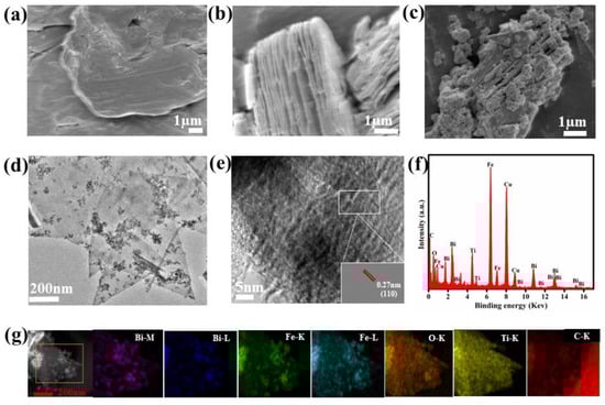 Next, the morphological structure and elemental composition of the prepared BiFeO₃/MXene are shown in Figure 2. SEM images in Figure 2a,b, indicate the clear difference between the MAX phase and MXene as a result of Al etching from the MAX phase. In contrast to the BiFeO3/MXene composite, pure MXene exhibits the characteristic superposed ultrathin sheet structure (Figure 2b), while the latter is decorated with BiFeO3 nanoparticles on both sides of the material’s surface (Figure 2c). Figure 2d presents the typical TEM images of the BiFeO₃/MXene hybrid; it is clear that BiFeO3 nanoparticles firmly adhere to the surface of MXene, which is in agreement with the SEM results. The HR-TEM in Figure 2e confirms the crystalline structure of BiFeO3, with apparent lattice fringes and a spacing of 0.27 nm corresponding to the (110) plane of the BiFeO3 phase [36]. Energy dispersive X-ray (EDX) analysis indicated the presence of Bi, Fe, O, Ti, and C (Figure 2f). It can be seen that the BiFeO3 nanoparticles disperse evenly on the MXene nanosheets, as shown in energy-dispersive X-ray spectroscopy (EDX) elemental maps (Figure 2g).