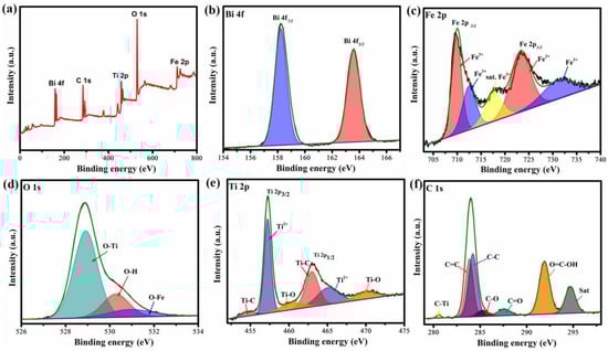 The elemental composition and bonding behavior of the BiFeO3/MXene were studied using XPS. Figure 3a shows several core peaks of Bi, Fe, O, Ti, and C, indicating that the material is not composed of a single phase. The high-resolution spectrum of Bi 4f (Figure 3b) shows two different characteristic peaks at 158.1 and 163.5 eV, which correspond to the spin-orbit components of Bi 4f7/2 and Bi 4f5/2, respectively. According to the literature, this means that bismuth has an oxidation state of 3+ [39,40]. The high-resolution XPS spectrum of Fe 2p (Figure 3c) displayed two main peaks, at 709.8 and 723.4 eV, corresponding to Fe 2p3/2 and Fe 2p1/2, respectively. These two peaks are known to be associated with the ionic states of Fe. The deconvoluted Fe 2p XPS spectrum shows the appearance of peaks and satellite peaks corresponding to the existence of Fe3+ and Fe2+ states. The satellite peaks at 717.7 eV are very sensitive to the ionic states of Fe. Therefore, they can also be used to qualitatively determine the oxidation states of Fe. The coexistence of two oxidation states of Fe suggests the presence of oxygen vacancies in the BiFeO3/MXene composites, where electron exchange between Fe3+-O-Fe2+ states may stabilize the charge imbalance in the system that emerged due to oxygen vacancies [41]. The XPS spectra of O 1s (Figure 3d) showed three peaks from the curve deconvolution at 528.8, 530.2, and 531.4 eV, which are ascribed to the lattice oxygen of anatase TiO2(O−Ti), hydroxyl oxygen(O−H), and surface-adsorbed oxygen species (O−Fe), respectively [42]. The high-resolution spectrum of Ti 2p represents three doublets (Ti 2p3/2 and Ti 2p1/2) (Figure 3e). The first, at 454.4 and 463.0 eV, the second, at 457.2 and 465.1 eV, and the third, at 460.3 and 470.2 eV, can be attributed to Ti–C, Ti(II), and Ti–O, respectively [43,44]. The XPS spectra of C 1s (Figure 3f) showed the peaks from the deconvolution located at 280.7, 283.8, 284.2, 285.2, 287.6, 291.8, and 294.7 eV which could be assigned to Ti−C, C=C, C−C, C−O, C=O, O=C−OH, and an interaction satellite, respectively [29,45]. In addition, using XPS elemental composition data (at. %), the ratio of BiFeO3: MXene was calculated to be 1:4.
