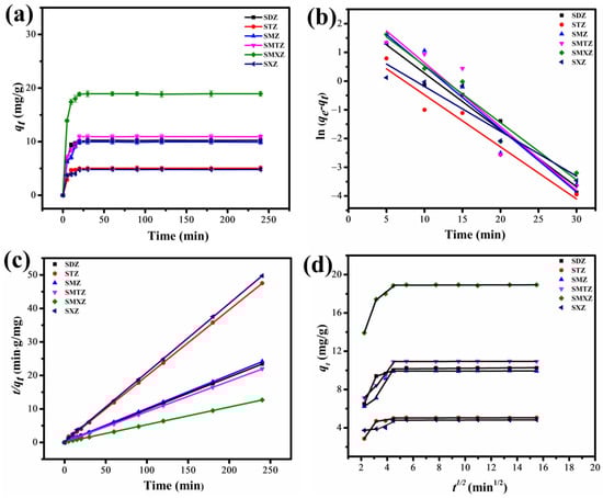 where qe (mg g−1) and qt (mg g−1) are the adsorption capacity at equilibrium time and time t (min), respectively; k1 (g mg−1 min−1) is the pseudo-first-order rate constant; k2 (g mg−1 min−1) represents the second-order rate constant; kid (mg g−1⋅min1/2) is the intraparticle diffusion rate constant; and c (mg g−1) is the constant that represents the thickness of the boundary layer.