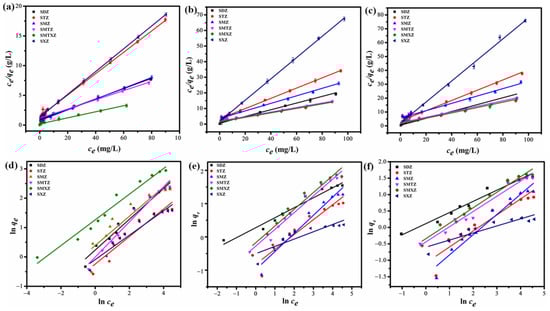 (a) Langmuir fitting curves, (a) BiFeO3/MXene, (b) MXene, and (c) BiFeO3. Freundlich fitting curves (d) BiFeO3/MXene, (e) MXene, and (f) BiFeO3 for sulfonamides adsorption in a mixed system at pH 6.