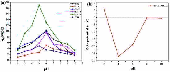 The pH of the solution can have a significant impact on the chemical characteristics and structure of the adsorbent, as well as on the adsorbate itself, during the adsorption process. Additionally, as sulfonamides are amphoteric compounds, their adsorption process is greatly influenced by pH [57]. Therefore, as the pH deviates from its pKa, the sulfonamide’s current form will alter and have an impact on the effectiveness of adsorption. The pka of the six sulfonamides are shown in Table S1. When pH < pKa, sulfonamides mainly exist in the form of cations while when pH > pKa, sulfonamides exist in the form of anions. To study the effect of pH on sulfonamides adsorption, experiments were conducted at pH values ranging from 2 to 10. As shown in Figure 6a, the adsorption capacity of BiFeO3/MXene increased with the increase in pH and reached the maximum when the pH was 6 for SDZ, STZ, SMZ, and SMTZ and 5 for SMXZ and SXZ. To further understand the effect of pH on the adsorption of the six sulfonamides, the zeta potential of BiFeO3/MXene was investigated, as shown in Figure 6b. It can be seen that BiFeO3/MXene reached the isoelectric point (PZC) at a pH of about 2.2. Therefore, BiFeO3/MXene was positively charged when the pH was less than 2.2 due to the protonation of surface functional groups, and became negatively charged when the pH was greater than 2.2 due to deprotonation. Due to the existence of oxygen-containing functional groups, with the increase in the pH value, the surface of BiFeO3/MXene became deprotonated, and the negative charge on its surface enhanced the electrostatic attraction between the material and positively charged sulfonamides, thereby increasing the adsorption capacity.