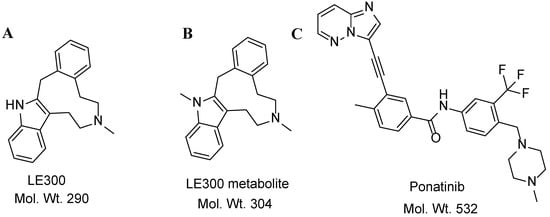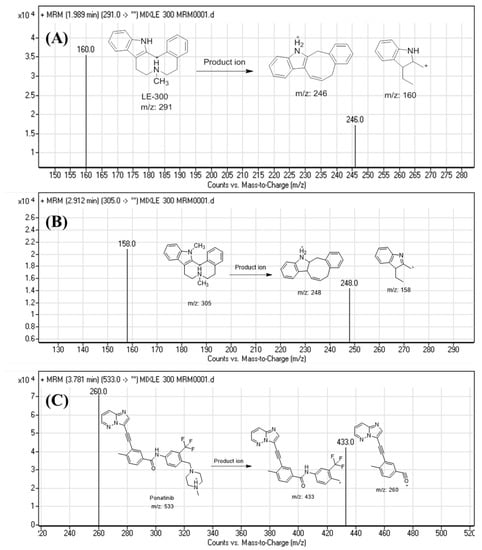 Upon a literature review, we found three analytical methods to quantify LE300 and MLE300 [6,7,8]. When using the spectrofluorimetric method [6], the linearity ranges from 5 to 100 ng/mL, which is less sensitive than our method and involves a longer sample preparation time. In the HPLC–Fluorescence method [7], the linearity ranges from 4 to 500 ng/mL, which is less sensitive than our method and consumes a lot of solvents, as the flow rate is 1 mL/min. In the microemulsion liquid chromatography method [8], the linearity ranges from 10 to 400 ng/mL for LE-300, which is much lower in comparison to our developed methodology. Hence, our established method is more sensitive, faster, and consumes less solvent than previously reported methods. No LC-MS/MS method has been reported for the analysis of LE300 and/or its N-methyl metabolite. This work describes, for the first time, the establishment and validation of an LC-MS/MS method for the simultaneous quantification of LE300 and its metabolite, MLE300 (Figure 1B), in rat plasma using a 50 mm C18 column using Ponatinib (Figure 1C) as the internal standard.