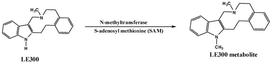 Methylation is a relatively minor conjugation pathway in drug metabolism, but it is very important in the biosynthesis of endogenous compounds, such as epinephrine and melatonin; and in the catabolism of biogenic amines, such as dopamine, serotonin, and histamine. In many cases, this conjugation results in compounds with decreased biological activity [5]. Methylation is a two-step process. First, the methyl-transferring coenzyme, S-adenosylmethionine (SAM), is biosynthesized mostly from methionine in a reaction catalyzed by methionine adenosyltransferase. Then, the SAM is utilized in the transfer of the activated methyl group to the acceptor molecule (LE300), as shown in Figure 2. Heterocyclic nitrogen atoms molecule such as LE300 are susceptible to N-methylation in human results in compounds with decreased biological activity.