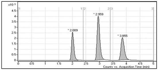 Numerous trials were performed to obtain the maximum mass response by adjusting all chromatographic parameters so as to enhance resolution and sensitivity. The pH of the aqueous portion of the elution system can improve the analytes’ ionization and adjust peak shape. Various mobile phase compositions were tested. The adjusted condition was as follows: 42% ACN, 58% 10 mM ammonium formate in water (pH~4.2). LE300, MLE300, and Ponatinib (IS) elution times were 2.0, 3.0, and 3.8 min, respectively, using the optimized chromatographic conditions. We investigated the use of different internal standards such as pemigatinib, nateglinide, repaglinide, chloroquine, and hydroxychloroquine, but such internal standards either showed poor peaks or led to overlapping with LE300 or MLE300. Ponatinib was selected as the method’s IS, whereas it has a higher extraction recovery (≥99%) and performance characteristics for LE300 and MLE300 [9]. Sample processing by liquid–liquid extraction and protein precipitation using different solvents was tried. It was found that protein precipitation utilizing acetonitrile is the optimum method with regard to simplicity, affordability and easier sample processing. A 5 min run time was enough to achieve complete elution of the three analytes (LE300, MLE300, and IS) without carryover being noticed in a blank rat plasma sample. Figure 3 shows overlayed chromatograms with good resolution for the calibration levels of LE300, MLE300, and IS in rat plasma.