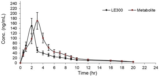 Concentration vs. time profile of LE300 and MLE300 in rat plasma after LE300 (10 mg/kg) oral administration. Each data represents the mean ± SD of six rats.
