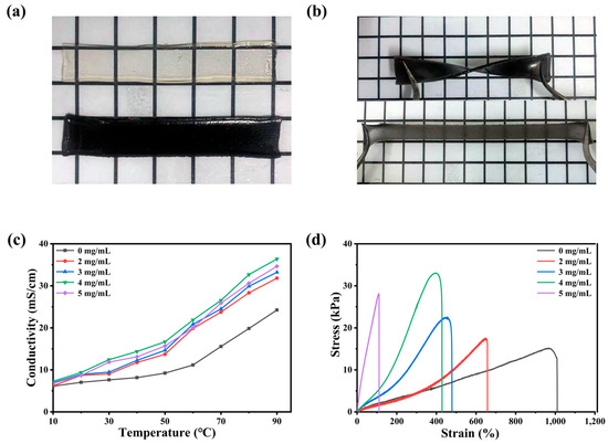Electron photograph of ionogel. (a) PAIM-X ionogel and PAI ionogel; (b) twisted and strained PAIM-X hydrogel; (c) the conductivity of the different MXene content of PAIM ionogels as a function of temperature; (d) stress–strain curves of PAIM-X ionogel with different MXene content.