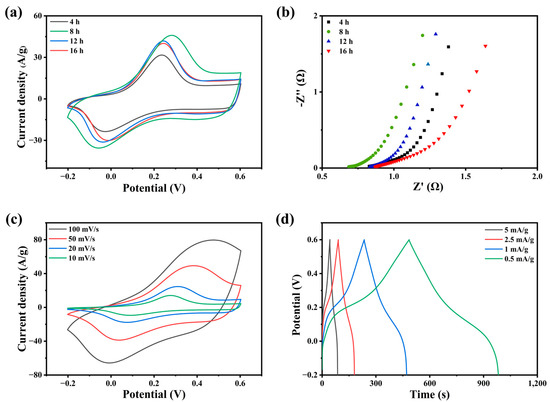 The electrodes with different polymerization times were coated on graphite paper and named PANI-4, 8, 12, 16. Figure 3a shows the CV curve of polyaniline electrode with polymerization time. It can be seen from the image that the electrode with PANI-8 has the largest integral area. According to Nyquist curve (Figure 3b), the EIS curve of PAIN-8 has the smallest intercept with the X-axis, while the intercept of PANI-12 and PANI-16 is larger, which is due to the low equivalent series resistance caused by their stacked structure. Compared with other curves, the PANI-8 curve has a steeper slope, indicating that its ionic diffusion impedance is lower and it has better electrochemical performance. This corresponds to the micromorphological phenomena observed by the electron microscope. Figure 3c shows that the redox peak of the polyaniline electrode appears at 0.3 V. With the increase in scanning rate, the redox peak of the polyaniline electrode shifts to high potential, and its curve shape changes regularly, which shows that it has good discharge performance. Combined with previous work, a polyaniline electrode with excellent electrochemical properties was successfully synthesized according to the discharge law of polyaniline. In Figure 3d, an obvious discharge plateau appears at 0.3 V, which is completely consistent with the CV curve. The existence of the discharge platform proves that polyaniline undergoes a redox reaction during charging and discharging. In this process, charge transfer occurs between interfaces, which greatly increases the discharge time of the capacitor [25].