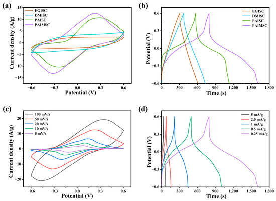 (a) CV curves of four devices (EGISC, DMISC, PAISC, and PAIMSC) at 50 mV/s. (b) GCD curves of four devices at 0.25 mA/g. (c) CV curves of PAIMSC devices at different scanning rates. (d) GCD curves of PAIMSC at different current densities.