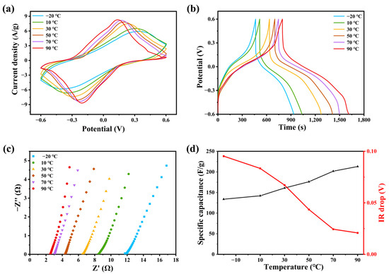 Figure 5a is cyclic voltammetry curve at a scanning rate of 20 mV/s, which is carried out at different temperatures from −20 °C to 90 °C. All the six CV curves show obvious pseudocapacitance behavior. The CV curve showed obvious pseudocapacitance, and two large oxidation–reduction peaks appeared at the corresponding potential. This is due to the presence of redox in acidic conditions, and the shape of the reaction curves varies regularly with scanning rate and temperature. With the increase in temperature, the integral area of the CV curve increased obviously, and the oxidation–reduction peaks shifted. This is because the increase in temperature promotes the charge transfer and reduces the resistance of oxidation and reduction, so it promotes the oxidation and reduction process. The oxidation potential moves to the low potential, and the reduction potential moves in the corrected direction [28,29,30].