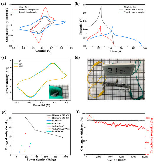In order to verify the application and repeatability of the PAIMSC, after two PAIMSCs were connected in series and in parallel, they were tested for CV and GCD. The results of Figure 6a,b show that the CV window and maximum current of the series PAIMSCs can reach twice that of a single PAIMSC. In the series circuit, the electrochemical window increased from 1.2 V to 2.4 V. At the same time, in the parallel circuit, the CV curve area and discharge time from one PAIMSC to two PAIMSCs almost doubled. It shows that each integrated device manufactured has similar performance. In addition, by connecting these two devices in series (Figure 6d), we can light up an LED electronic watch, which shows its application prospect [35,36,37].