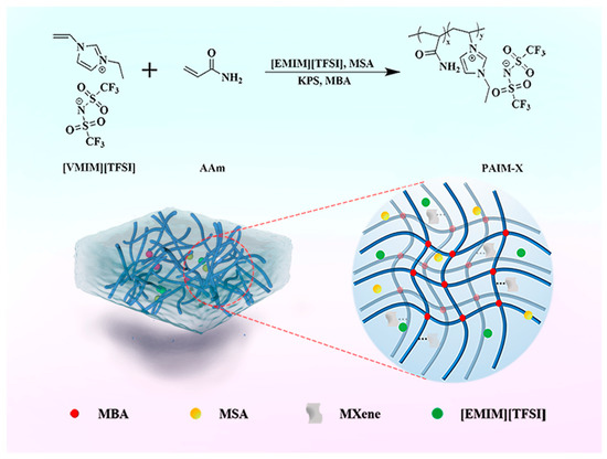 MXene powders of different masses were added to 0.5 mL MSA for ultrasonic treatment to form uniform viscous solution. A total of 0.2 g AAm, 1.7 mL [EMIM][TFSI], 0.05 mL [VMIM][TFSI], 0.3 mL MSA, 0.02 g KPS, and 0.02 g MBA were added to the reagent bottles and stirred continuously. A total of 0.02 mL TMEDA was added when there was no solid in the solution. The solution was added to the mold (400 × 100 × 2 mm3) and placed in an oven at 50 °C for 4 h to obtain PAAM/IL/MXene-X ionogel (PAIM-X). X is the amount (mg/mL) of MXene added: X = (0, 2, 3, 4, 5). The synthesis process and formation mechanism of PAIM-X ionogel are shown in Figure 7.