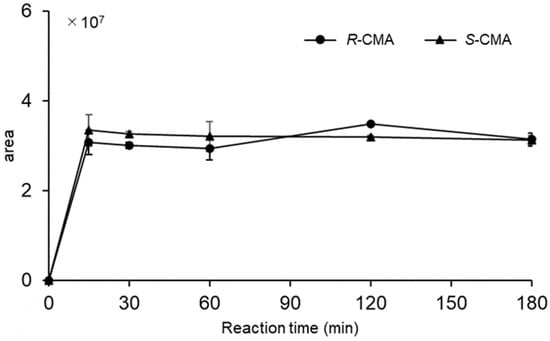 The optical rotations of the R- and S-CMA standards obtained from the suppliers were measured first; R-CMA (0.46 in 1 M HCl) and S-CMA (0.48 in 1 M HCl) exhibited rotations of –11.4341 and +18.0296, respectively.