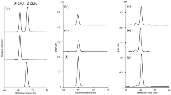 Standard and representative chromatograms of apple extracts. (a) standard R- and S-CMA derivatized (b) Tsugaru peel, (c) Tsugaru fruit, (d) Sun-Tsugaru peel, (e) Sun-Tsugaru fruit, (f) Toki peel, and (g) Toki fruit.