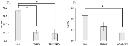 R-CMA contents in apple samples: (a) peel and (b) fruit (*: p < 0.05 by Tukey multiple comparison).