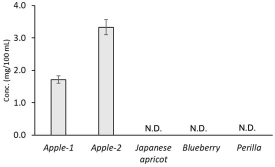 To certify that apples contain only R-CMA, we examined two types of commercial apple juice manufactured using cultivated apples, as well as a selection of other juices. It was revealed that only apple juice contains R-CMA, whereas no CMA was detected in the other commercial juices, including blueberry, Japanese apricot, and perilla.