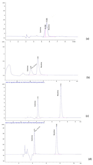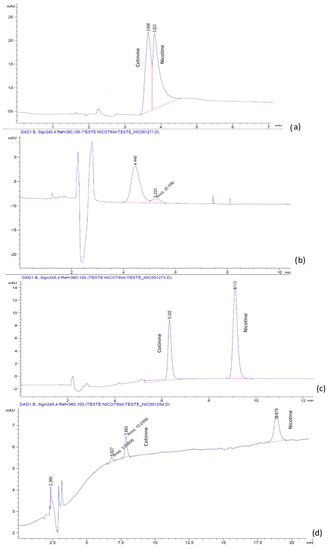 - Petersen, G.O.; Leite, C.E.; Chatkin, J.M.; Thiesen, F.V. Cotinine as a biomarker of tobacco exposure: Development of a HPLC method and comparison of matrices. J. Sep. Sci. 2010, 33, 516–521. [Google Scholar] [CrossRef] [PubMed]