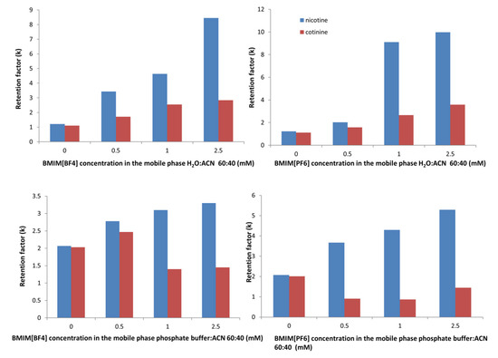 However, the nicotine retention showed a higher increase with the IL concentration in all situations. The maximum retention time for nicotine was 18.8 min in the water-based mobile phase at the maximum concentration of BMIM[PF6] of 2.5 mM.