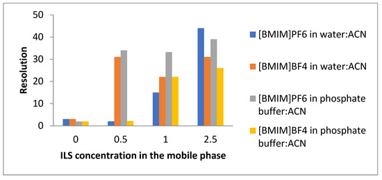 Figure 6 shows the variation in the resolution between the target compounds at the different concentrations of the ILs. The results revealed that the optimum condition for the separation of these compounds in a reasonable time was that where the mobile phase consisted of phosphate-buffer:ACN with the addition of [BMIM]BF4 at a 1 mM concentration. The resolution improvements can be explained by changes in the selectivity and the relative retentions as well as by the enhancement in the peak profile upon the addition of the ILs.