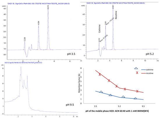 Chromatograms and variation in the pH-dependent retention factor for nicotine and cotinine with mobile phases containing H2O:ACN 60:40 and 1 mM BMIM[BF4].