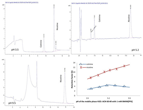 Chromatograms and variation pH-dependent retention factor for nicotine and cotinine with mobile phases containing H2O:ACN 60:40 and 1 mM BMIM[PF6].