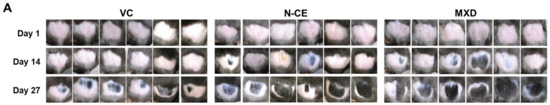 Figure 1 shows the percentage of hair-growing areas in mice 14 and 27 days after application of the adjusted sample (N-CE, MXD and a vehicle control-VC) in the mouse back skin hair-growing experiment (Figure 1A). Fourteen days later, the hair-growing rate of N-CE was slightly lower than that of MXD, but 27 days later, the hair-growing effect was as high as that of MXD (Figure 1B).