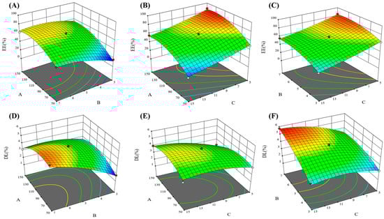 3D effect surface map of encapsulation efficiency and drug loading. In which (A–C) were encapsulation efficiency 3D effect surface map, and (D–F) were drug loading 3D effect surface map.