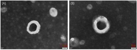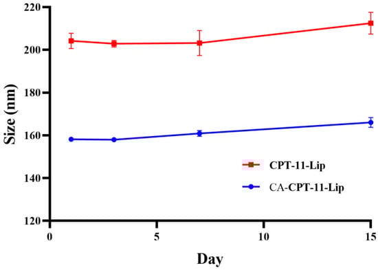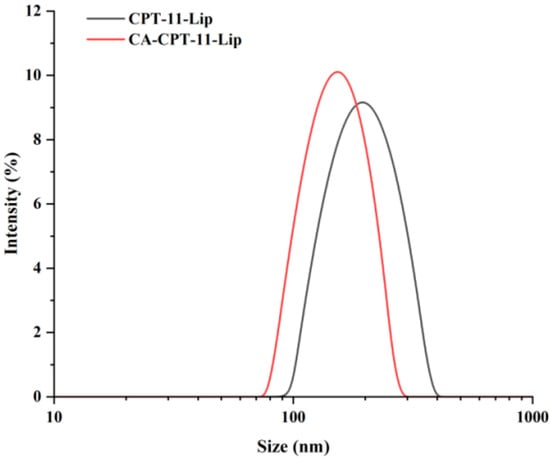 As shown in Figure 2, the morphology of the two liposomes was spherical, and the particle size was in accordance with our determination. Some other characteristics are shown in Table 6. The zeta potential values of CA-CPT-11-Lip and CPT-11-Lip were −56.93 ± 0.46 and −53.07 ± 1.47, respectively. Usually, a higher zeta potential is associated with better stability of the formulation, so both liposomes had certain stability [33]. The particle sizes of both liposomes were about 154.16 ± 4.92 nm and 197.70 ± 3.04 nm, respectively, and the PDI was small (PDI < 0.25). The particle size was less than 200 nm, which is beneficial to avoid physical clearance [29]. The EE of CPT-11-Lip was 74.54% and the DL was 3.73%, while CA-CPT-11-Lip was 82.04% and 3.72%. In terms of particle size, PDI and EE, CA-CPT-11-Lip showed advantages. Its particle size was smaller, PDI was lower, and EE was higher, especially the difference in particle size was obvious (Figure 3). Therefore, CA optimizes the properties of conventional liposomes.