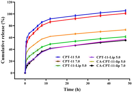 Cumulative release results of CPT-11, CPT-11-Lip, and CA-CPT-11-Lip in PBS solution of different pH.