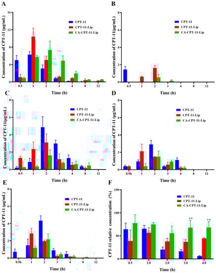 Concentration of CPT-11 in the liver (A), heart (B), spleen (C), lung (D), kidney (E), and the relative concentration of CPT-11 in the liver (F) (n = 3). Compared with the CPT-11-Lip group, ** p < 0.01.