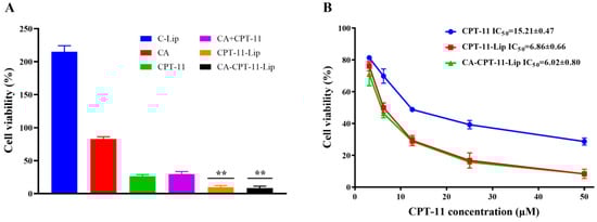 In vitro toxicity on HepG-2 cells of various preparations at 50 μM concentration (A) and in vitro HepG-2 cytotoxicity at different concentrations of CPT-11, CPT-11-Lip, and CA-CPT-11-Lip (B). Compared with CPT-11 group, ** p < 0.01.