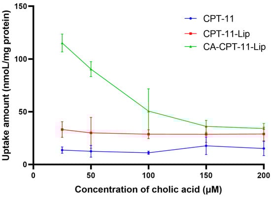 As shown in Figure 8, cholic acid pretreatment significantly attenuated the uptake of CA-CPT-11-Lip by HepG2 cells in a dose-dependent manner. In contrast, there was no significant change in the CPT-11-Lip and CPT-11 solution groups. These results were consistent with the study of Xiao et al., suggesting that cholic acid-modified liposomes can increase drug uptake, possibly through bile acid transport proteins on hepatocellular carcinoma cells [36]. In addition, we found that drug uptake was higher in the liposome groups than in the CPT-11 group, and the value was greatest in the CA-CPT-11-Lip group, further illustrating the liver targeting of cholic acid-modified liposomes.