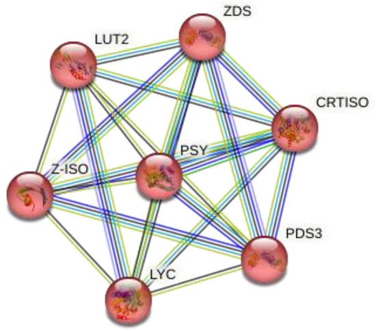 Similarly, Figure 3 represents the three-dimensional structure of PSY (phytoene synthase), which converts phytoene into zeta-carotene via the intermediary of phytofluene by the symmetrical introduction of two double bonds at the C-11 and C-11′ positions of phytoene. The zeta-carotene has a central C15-C15′ double bond in the cis configuration and it requires isomerization before being recognized as substrate by ZDS, the next enzyme in the lycopene biosynthesis pathway. The STRING interaction analysis (Figure 4) further explained that both ZDS and PSY have close association in various metabolic pathways as well as molecular function, which leads to production of beta-carotene and zeta-carotene bioactive compounds. For instance, lycopene epsilon cyclase (LUT2) catalyzes the single epsilon-cyclization reaction which converts lycopene to delta-carotene. Similarly, Z-ISO (15-cis-zeta-carotene isomerase) is involved in the biosynthesis of carotenoids, and CRTISO is involved in carotenoid and chloroplast regulation.