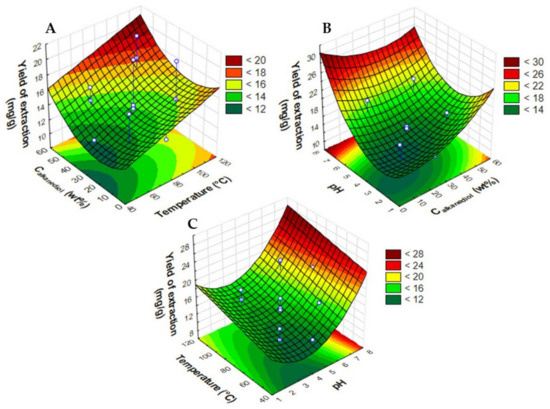 Response surface plots obtained for the CCRD (23) applying PLE regarding the alkanediol concentration (Calkanediol in wt%), temperature (°C), and pH in terms of yield of extraction of anthocyanins (mganthocyanins·gdry biomass−1). (A) Calkanediol and Temperature, (B) pH and Calkanediol, and (C) Temperature and pH.