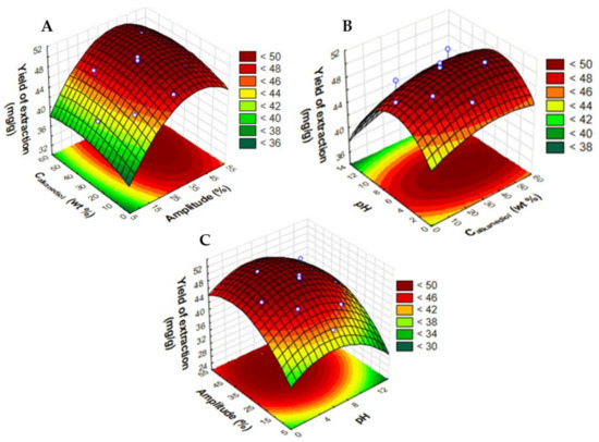 Response surface plots obtained for the CCRD (23) regarding the application of UAE, considering the alkanediol concentration (Calkanediol in wt%), amplitude (%), and pH in terms of yield of extraction of anthocyanins (mganthocyanins·gdry biomass−1). (A) Calkanediol and Amplitude, (B) pH and Calkanediol, and (C) Amplitude and pH.