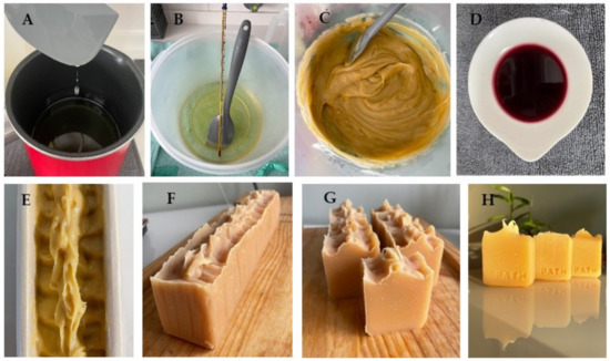 Juçara natural soap production. (A) Oil and butter heating; (B) melted butter and oil mixture; (C) soap mass before additives; (D) juçara extract (42.6% of 1,2-propanediol in 1:50 g/mL of juçara dried pulp); (E) parchment paper-lined molds filled with soap mass; (F) loaf of soap after 24 h; (G) soap bars; and (H) soap bars after cure.