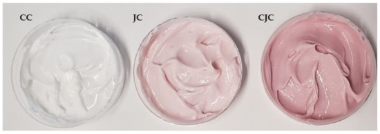Formulation creams evaluated in this work. (CC) Control cream; (JC) juçara cream; and (CJC) concentrated juçara cream.