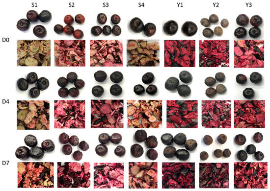 Whole fruits and flesh of the studied BP from seven trees (S1, S2, S3, S4, Y1, Y2, Y3) at three storage days (D0, D4, D7).
