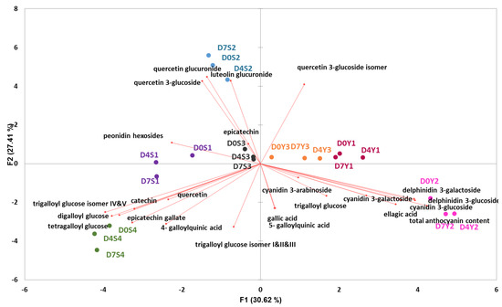 PCA bi− plots of phenolic compounds in Burdekin plums harvested from seven trees (S1, S2, S3, S4, Y1, Y2, Y3) on three storage days (D0, D4, D7).