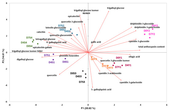 The concentration of identified compounds is listed in Table S1. To identify the main contributors to the observed variation in BP samples of different storage days and trees, the quantified phenolic compounds were subjected to principal component analysis (PCA). The first three components explained 72.6% of the total variance in the dataset.