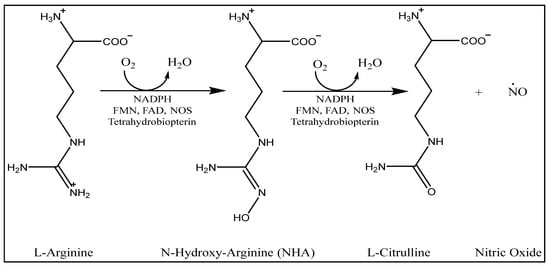 Since the identification of nitric oxide (NO) as the illusive endothelium-derived relaxing factor [1], it has been discovered that this simple molecule modulates a score of biological processes. In addition, NO is a hydrophobic free radical that diffuses easily through cell membranes [2]. The cardiovascular, neurological, and immunological systems are all regulated by nitric oxide. In the vasculature, platelet adhesion and aggregation, as well as smooth muscle cell (SMC) proliferation, are all inhibited by NO. Furthermore, NO plays a vital role in a variety of cardiovascular disorders, including atherosclerosis [3,4]. The endothelial, neuronal, and inducible nitric oxide synthase enzymes, abbreviated as eNOS, nNOS, and iNOS, respectively, all play a part in the biosynthesis of NO, and each of these enzymes is responsible for a different source site of NO. All known NOS enzymes function mainly in dimeric form when reducing equivalents from the reductase domain of one monomer activate the oxygenase domain of the other monomer. Arginine is the substrate of the NOS reaction, and its terminal guanidino nitrogen is oxidized by all three isoforms in a two-step reaction to produce NO and L-citrulline [5], Figure 1.