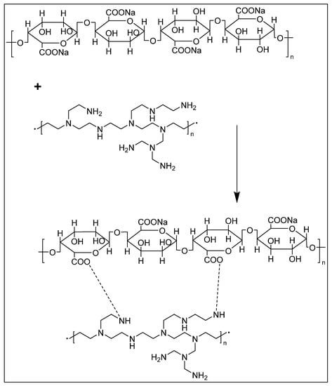 Alginates are naturally occurring, water-soluble linear polysaccharides extracted from several species of brown algae, such as Laminaria hyperborea and Macrocystis pyrifera, that are found worldwide in coastal waters [15]. Sodium alginate is one of the most widely used negatively charged polyelectrolytes that is rich in carboxylic groups due to its composition of β-D-mannuronic acid (M block) and α-L-guluronic acid (G block) units linked by β-1,4-glycosidic bond. In addition, alginate and its gel forms have a wide variety of applications. It has been extensively used as a biomaterial, which provides several advantageous features, including biocompatibility and non-immunogenicity. As stated earlier, alginate gels have been employed in a variety of applications, including wound healing, growth factor delivery, cartilage regeneration, cardiac remodeling, hepatic repair, and peripheral nerve regeneration [16]. Further, polyethyleneimine is a cationic synthetic polymer that contains several primary, secondary, and tertiary amine groups along its molecular chains [17,18]. The PEI itself is an excellent material for functionalizing and enhancing the properties of biomaterials in a variety of applications, including gene delivery [19], drug delivery [20], wound dressing [21], tissue engineering [22] and cell and enzyme immobilization [16,23].