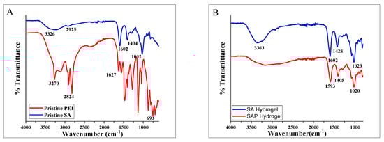 Fourier transform infrared (FTIR) spectra of (A) sodium alginate (blue trace) and polyethyleneimine (red trace), and (B) sodium alginate hydrogel (SA) and PEI modified sodium alginate hydrogel discs (SAP).