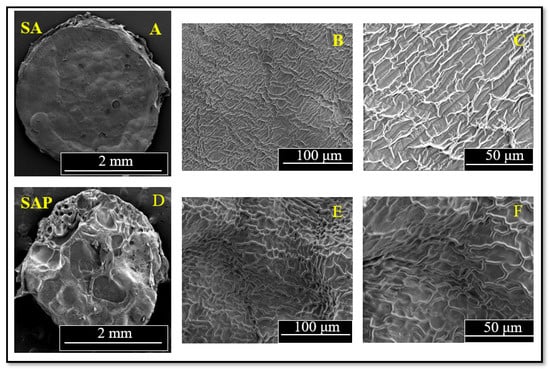 Scanning electron micrographs of sodium alginate hydrogel discs (SA) (micrographs (A–C), and of sodium alginate hydrogel discs modified with polyethyleneimine (SAP) (micrographs (D–F). Typical magnifications are: 50× for images (A,D), 1000× for images (B,E), and 2000× for images (C,F).