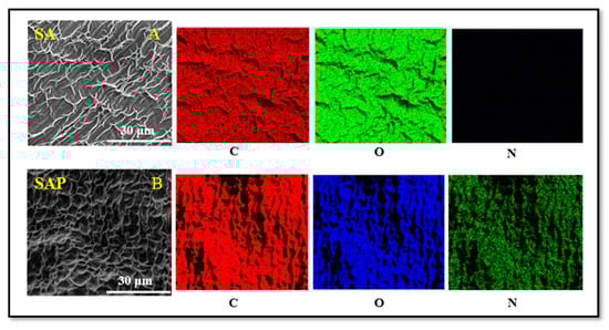 EDX mapping of carbon, oxygen, and nitrogen of sodium alginate hydrogel (SA) and of sodium alginate hydrogel modified with polyethyleneimine (SAP). The micrographs show the effective modification of the SA alginate hydrogel with PEI as shown with the significant increase of the nitrogen element in the EDX mapping.