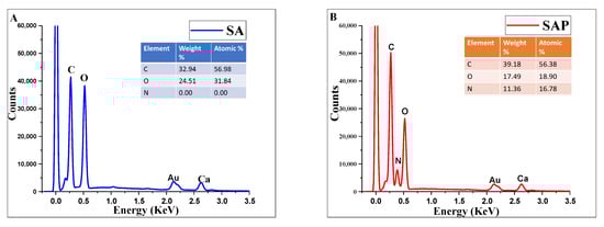 Furthermore, Figure 6 illustrates the difference in the nitrogen distribution peaks between the EDX spectra of SA and SAP. As expected, a new nitrogen peak arises in SAP because of the imine functionalities, but it is missing in SA.