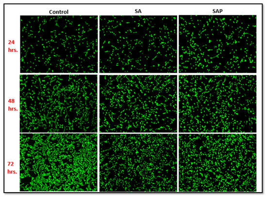 Fluorescence images of MDA-MB-231 cells stained with acridine orange (AO) and propidium iodide (PI) in the SA, SAP and control groups for 24 h, 48 h, and 72 h. The green spots staining with AO represent live cells, whereas the red dots staining with PI represent dead or dying cells.