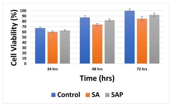 Upon staining with these dyes, images of hydrogels in cell cultures are acquired and compared. Figure 7 shows a comparative characterization of MDA-MB-231 cells cultured on sodium alginate (SA) and PEI-modified sodium alginate (SAP), as compared to controls and over different time periods (24 h to 72 h). Qualitatively, Figure 7 shows that cell viability is not significantly affected by sodium hydrogel (SA) or PEI-modified sodium hydrogel (SAP). In fact, one can visually see that cell viability on SAP is slightly higher than in the case of SA alone for all time windows.