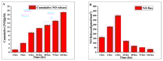 Figure 9A shows the cumulative catalytic production and release of NO into the reaction medium during the time of immersion. The initial increase in NO is rapid, but eventually reaches a plateau. For instance, the cumulative NO concentration released almost more than doubles during the first six-hour window (namely: 1.2 μM to 4.4 μM from 2 to 4 h, then grows to 9.4 μM in the 4 to 6 h-time range). The cumulative NO concentration continued to increase, but gradually, after 6 h, finally reaching a plateau after about 144 h.