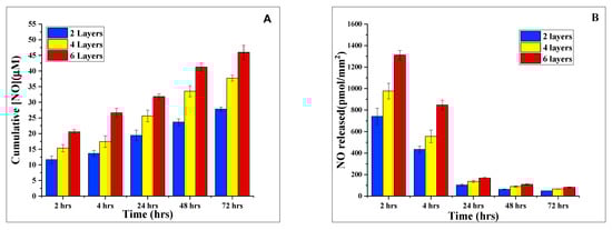 (A) Average cumulative NO concentration released from SAP/iNOSox hydrogel for various numbers of PEI/NOS layers over time periods of experiments extending from 2 h to 72 h. (B) Corresponding average surface NO flux of SAP/iNOSoxy for the various hydrogels calculated in the form of amounts of NO released per time unit and per unit surface area. Data represents mean ± SD (n = 3).